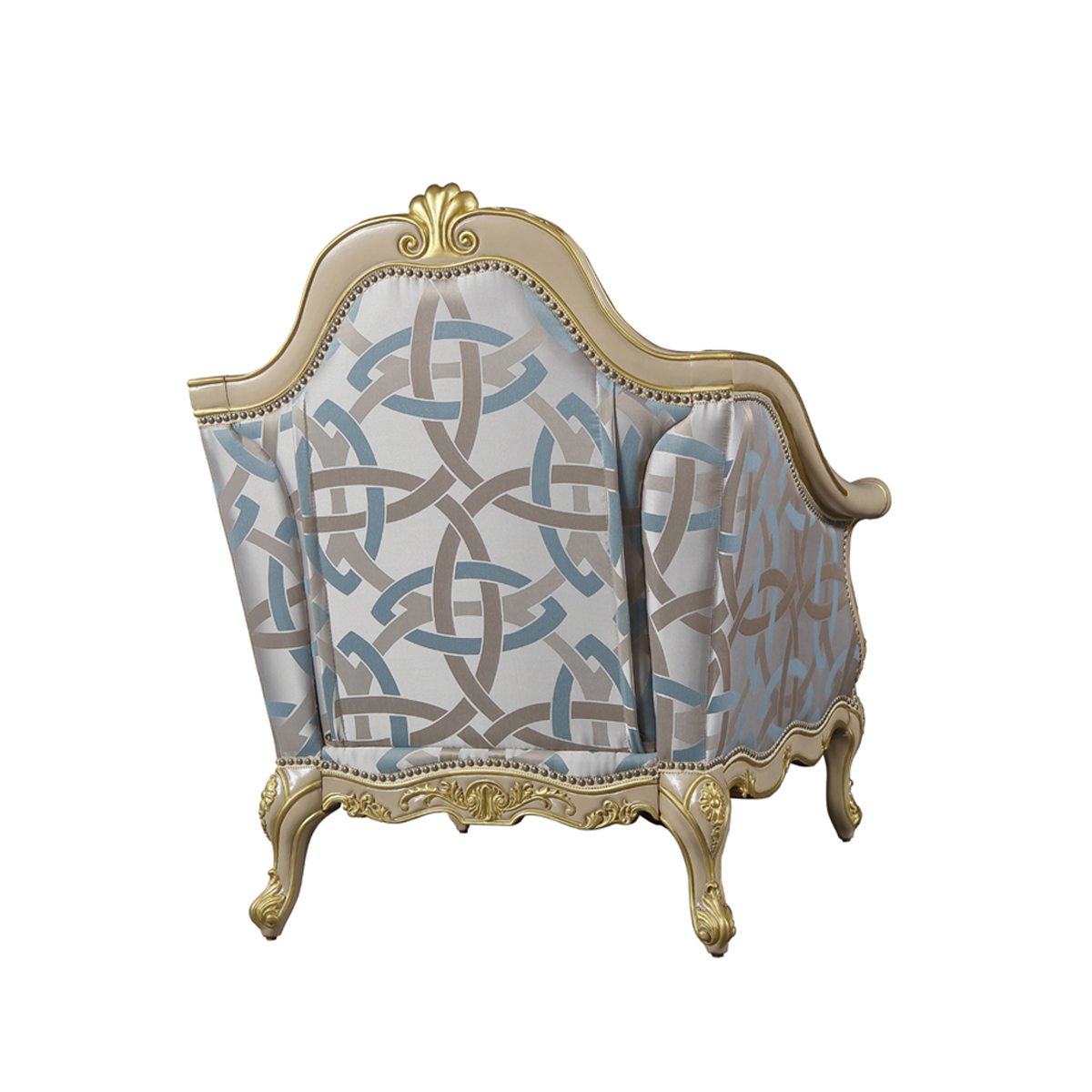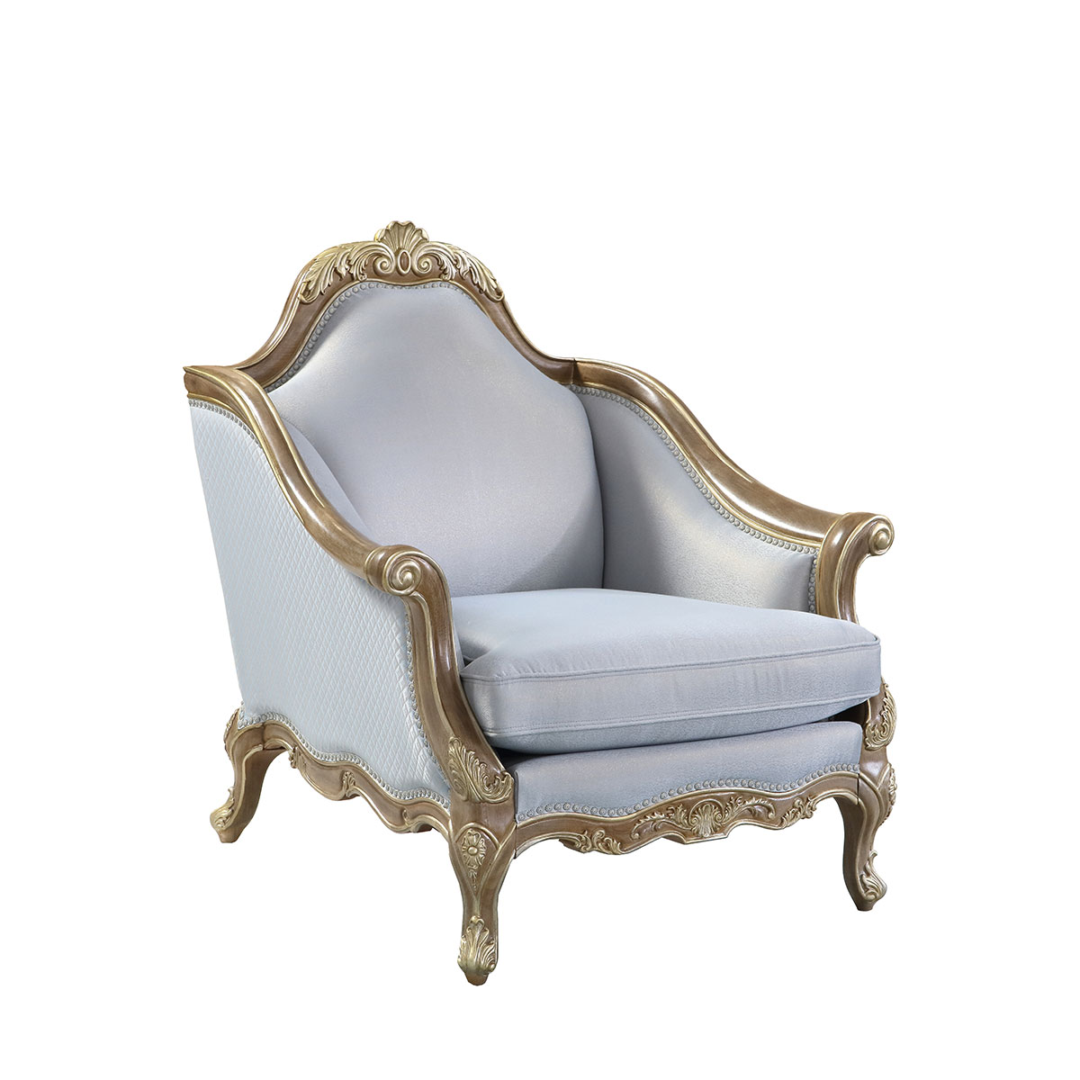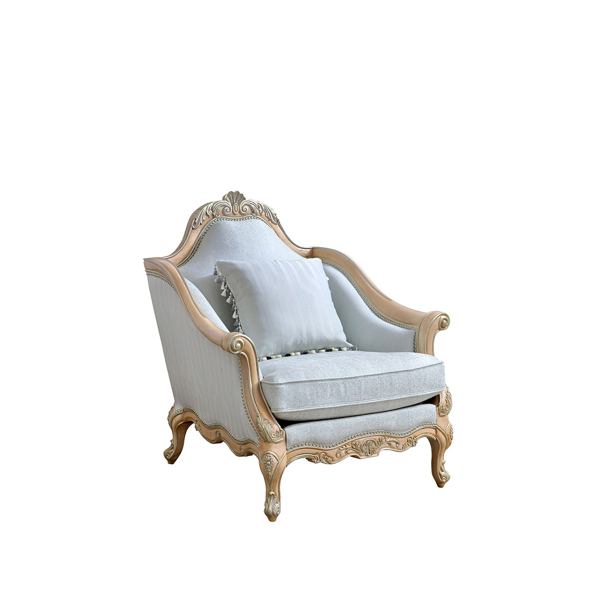 * 線條的沙發造型猶如連綿不斷的花海,實木的藤花雕刻搭配繁花點綴的沙發布藝,盡情演繹普羅旺斯的萬種風情,行如流水的銀色釘扣,給自由的生活空間裝飾上浪漫的色彩。