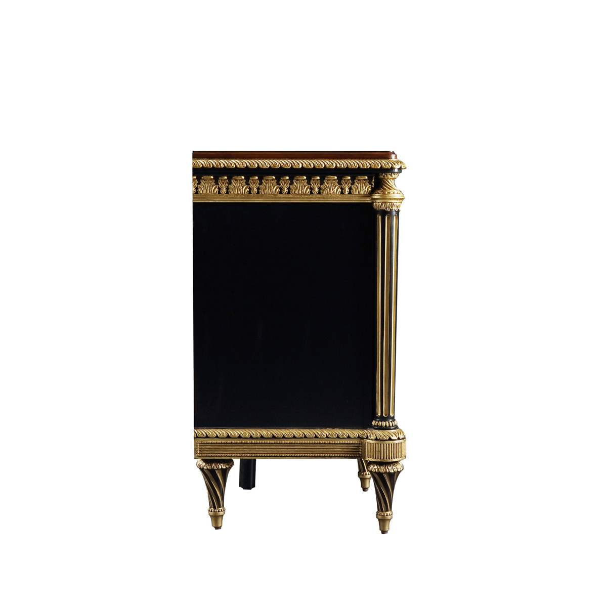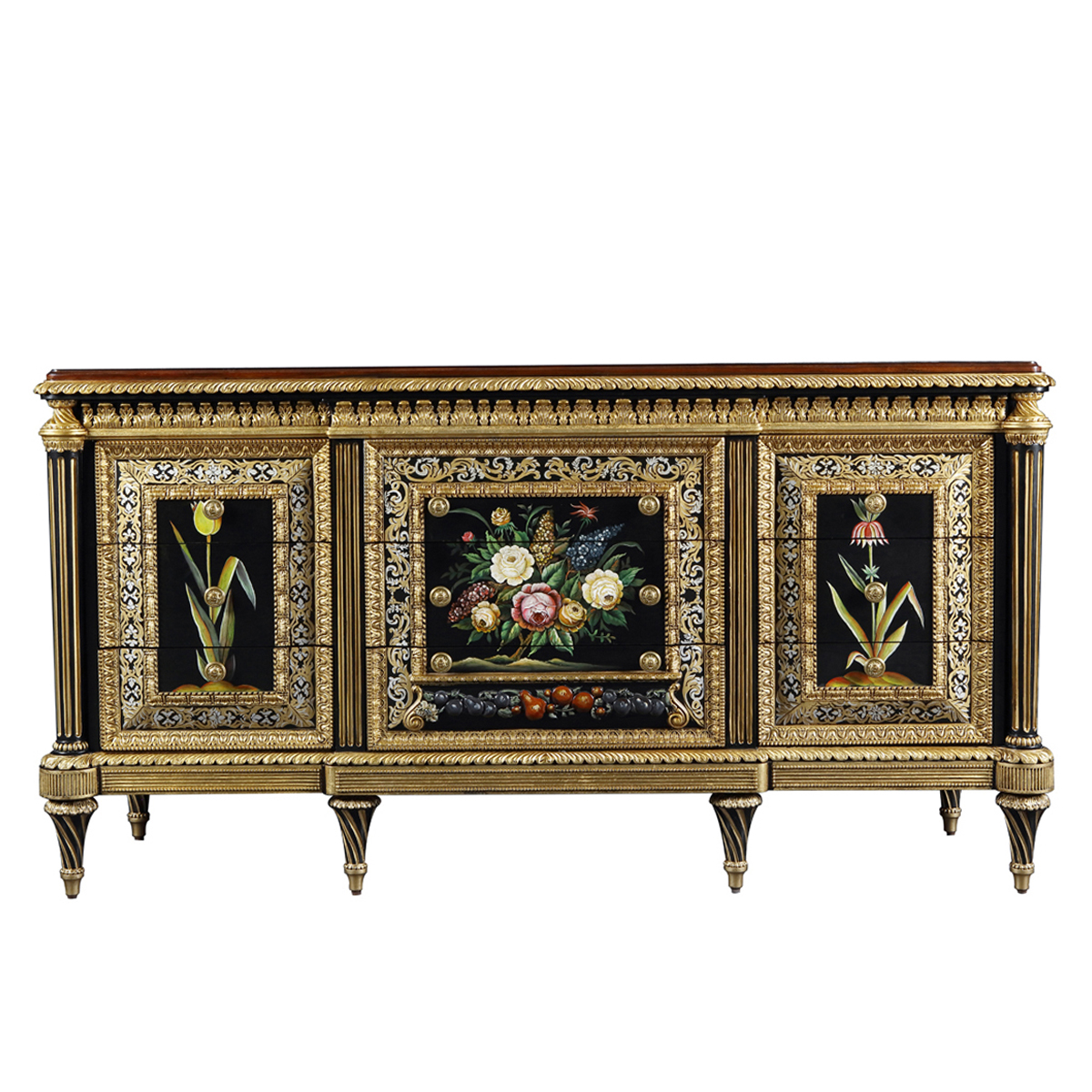 以英國溫莎堡中的新古典風格長柜為意念,設計出古典復刻版。絕美的植物彩繪和花朵蔓藤雕刻,撲捉溫莎城堡的淺谷繁花;英國皇室家具完美呈現,形象逼真地描繪了貴族家居生活美學的真諦。