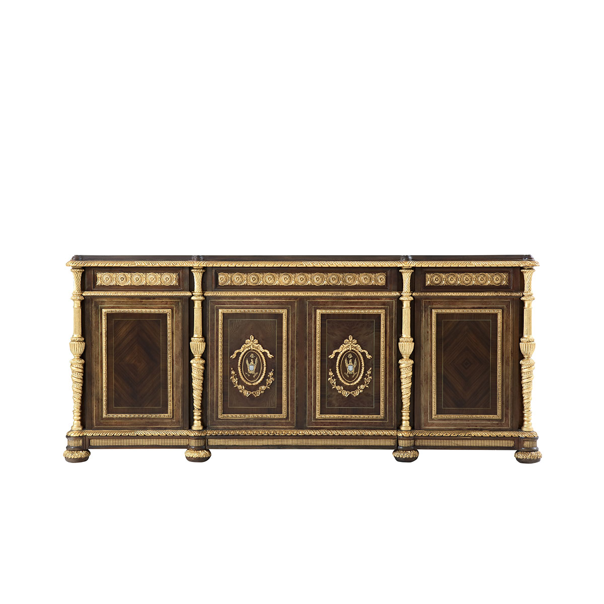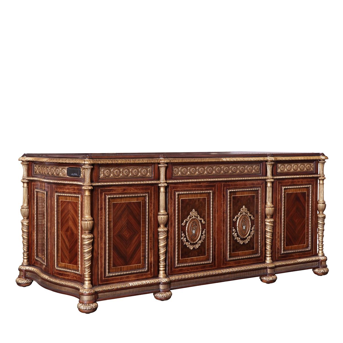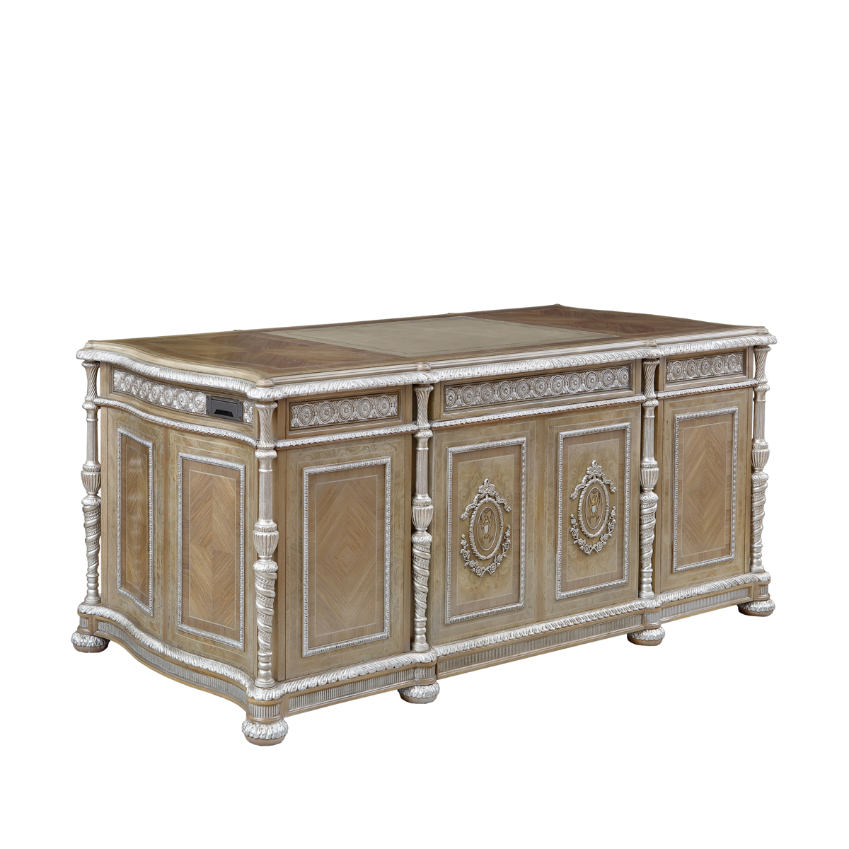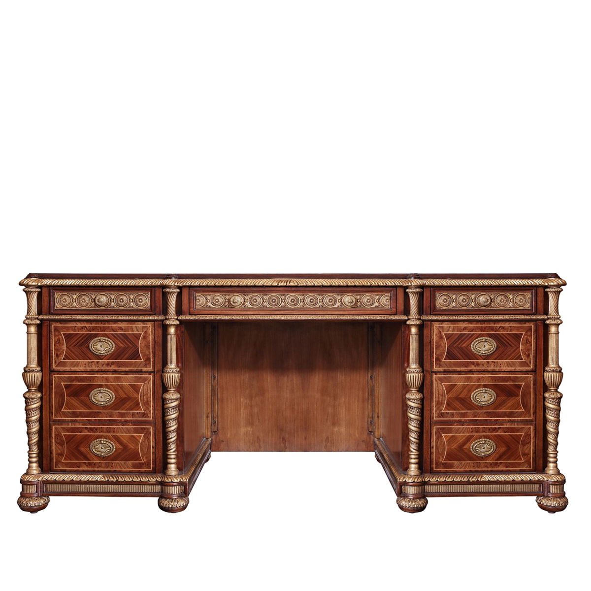 采用謝拉頓風(fēng)格經(jīng)典桌腿,上端配以常用的箍和腳輪,參考優(yōu)雅高貴的 Ionic Order(愛奧尼克式羅馬柱)雕刻,鑿刻出精致的手工雕刻細(xì)節(jié),以及輔以紋理清晰而有層次的木皮拼花,帶來(lái)溫莎堡皇廷般奢雅的辦公體驗(yàn)。