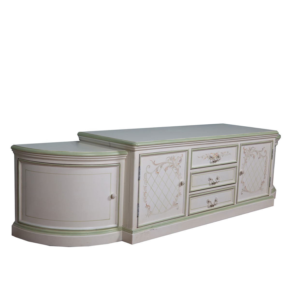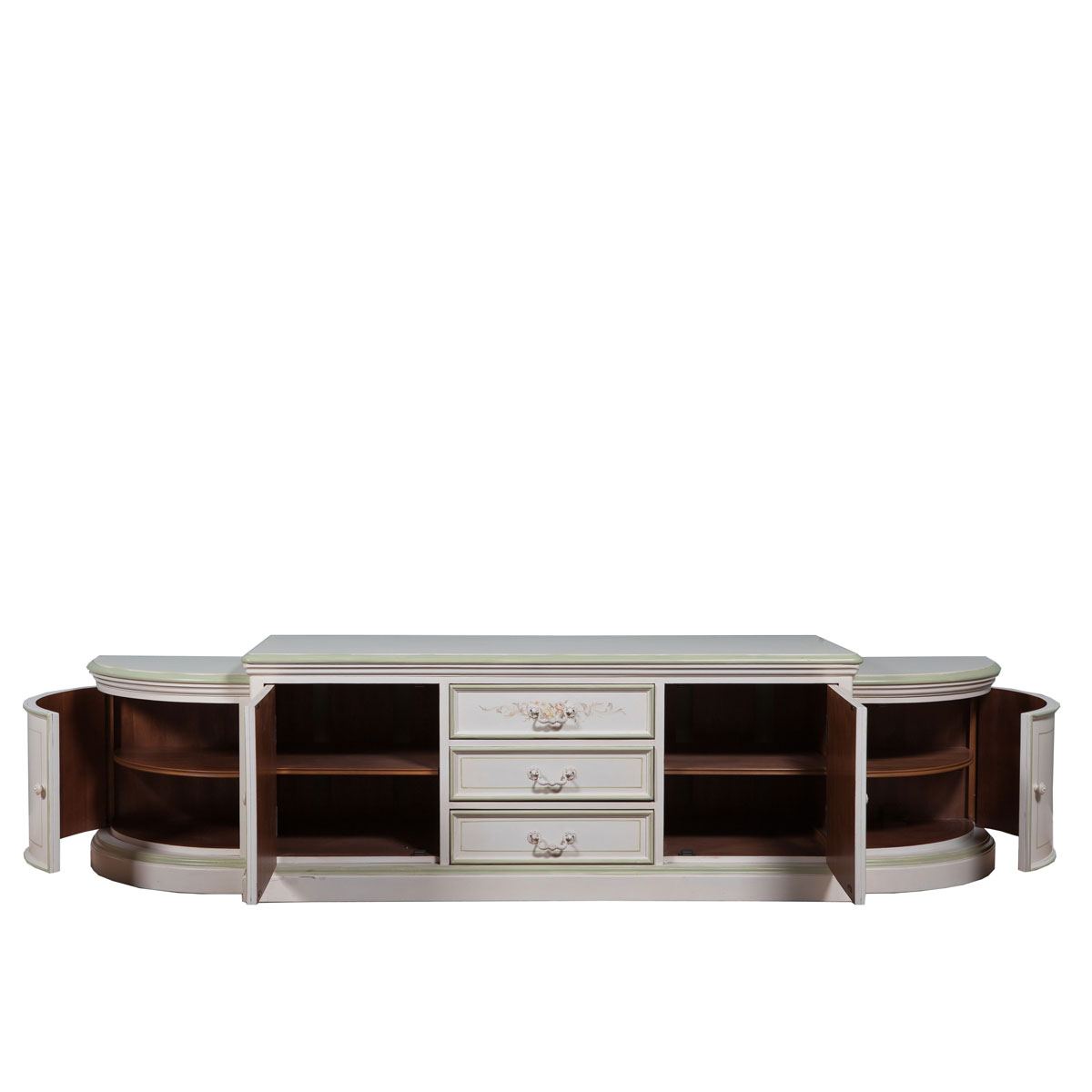* 手工拼花更顯藝術價值,左右合拼制成半月形狀 * 門內各有一塊可調層板 * 三個儲物抽斗,底部采用硬木實木滑軌 * 腳底部裝有可調整腳釘.