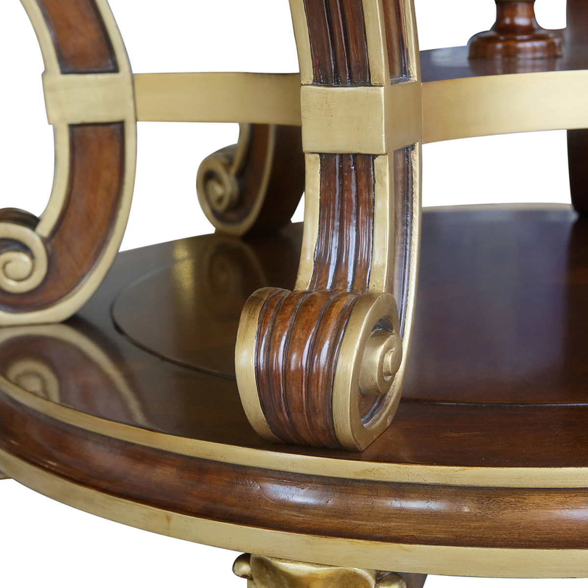 為表現英國皇室的華麗和莊嚴,以英國溫莎堡為設計元素。使用雕刻描金葉飾花紋,表現出英國王室的典雅氣質,配上代表勝利的旋渦狀支撐柱、精致的手工雕刻細節和貼金箔工藝,完美演繹了英式宮廷家具的奢華尊貴,可謂是極具典藏價值的傳世之作。