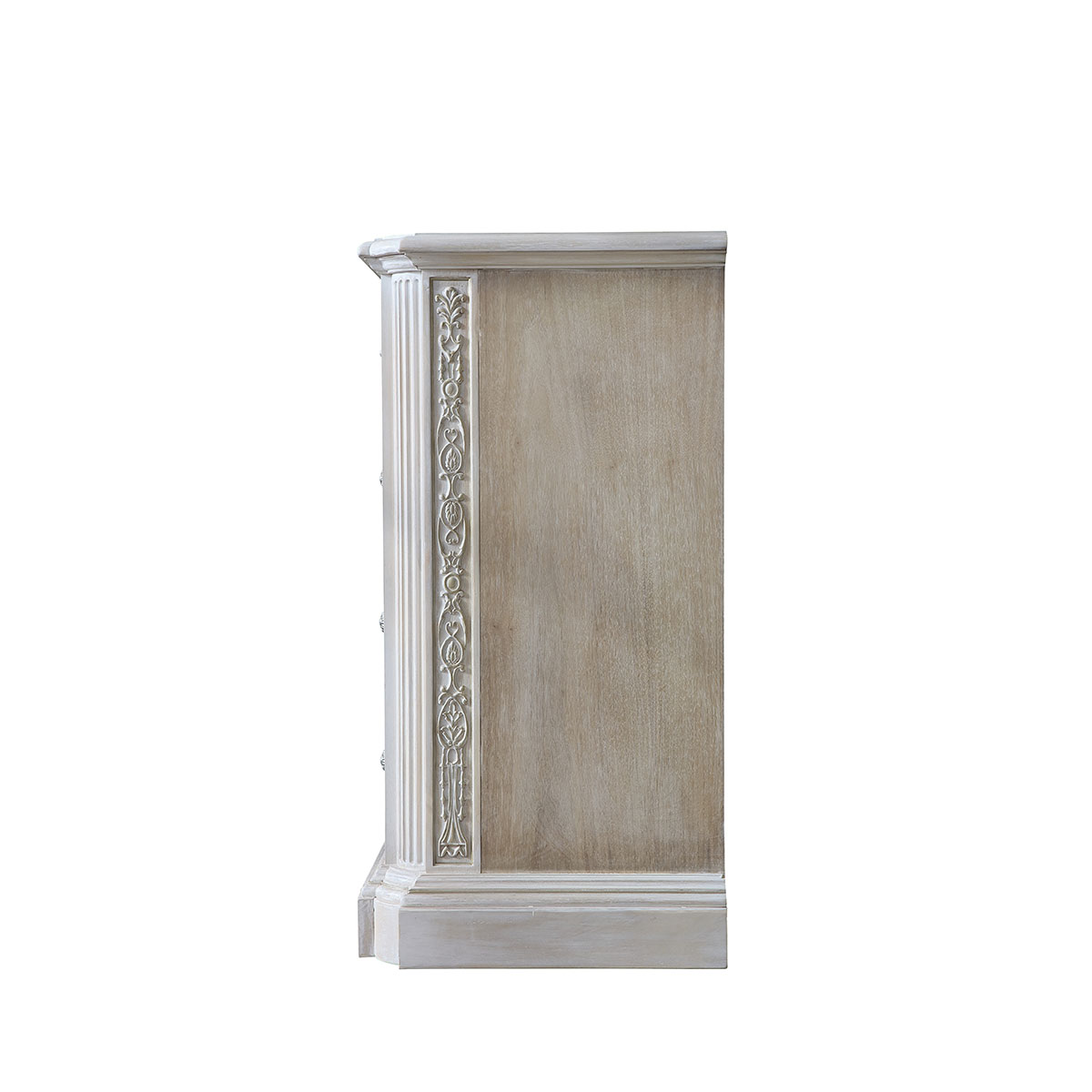充滿優(yōu)雅與紳士魅力的華盛頓香檳銀漆涂裝五斗柜,蹄型的底座,莊重穩(wěn)固;玻璃為畫(huà)板,銀箔壓花,在復(fù)古彩繪色調(diào)中傾注人性情感,原本單調(diào)的美便生動(dòng)了起來(lái)。使它不論從任何角度欣賞,都愈加美不勝收。