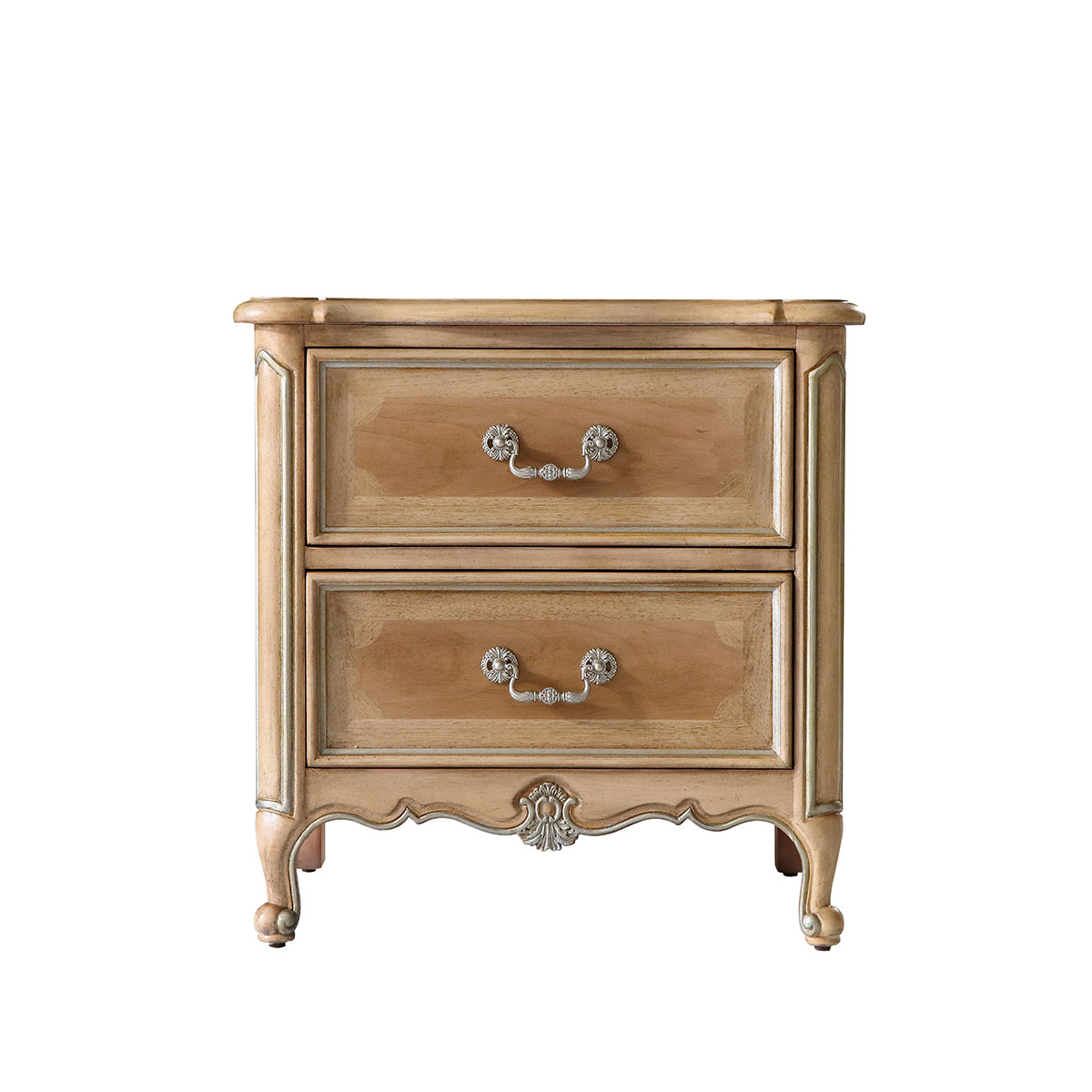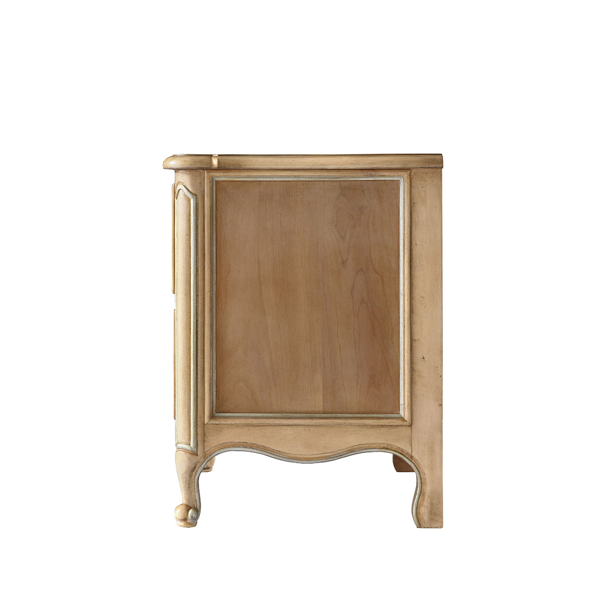"* 手工拼花藤蔓效果,用多種上等木皮拼制而成 * 二個儲物斗,底部采用經(jīng)典的硬木實木滑軌; * 腳腳底部裝有可調(diào)腳釘;"