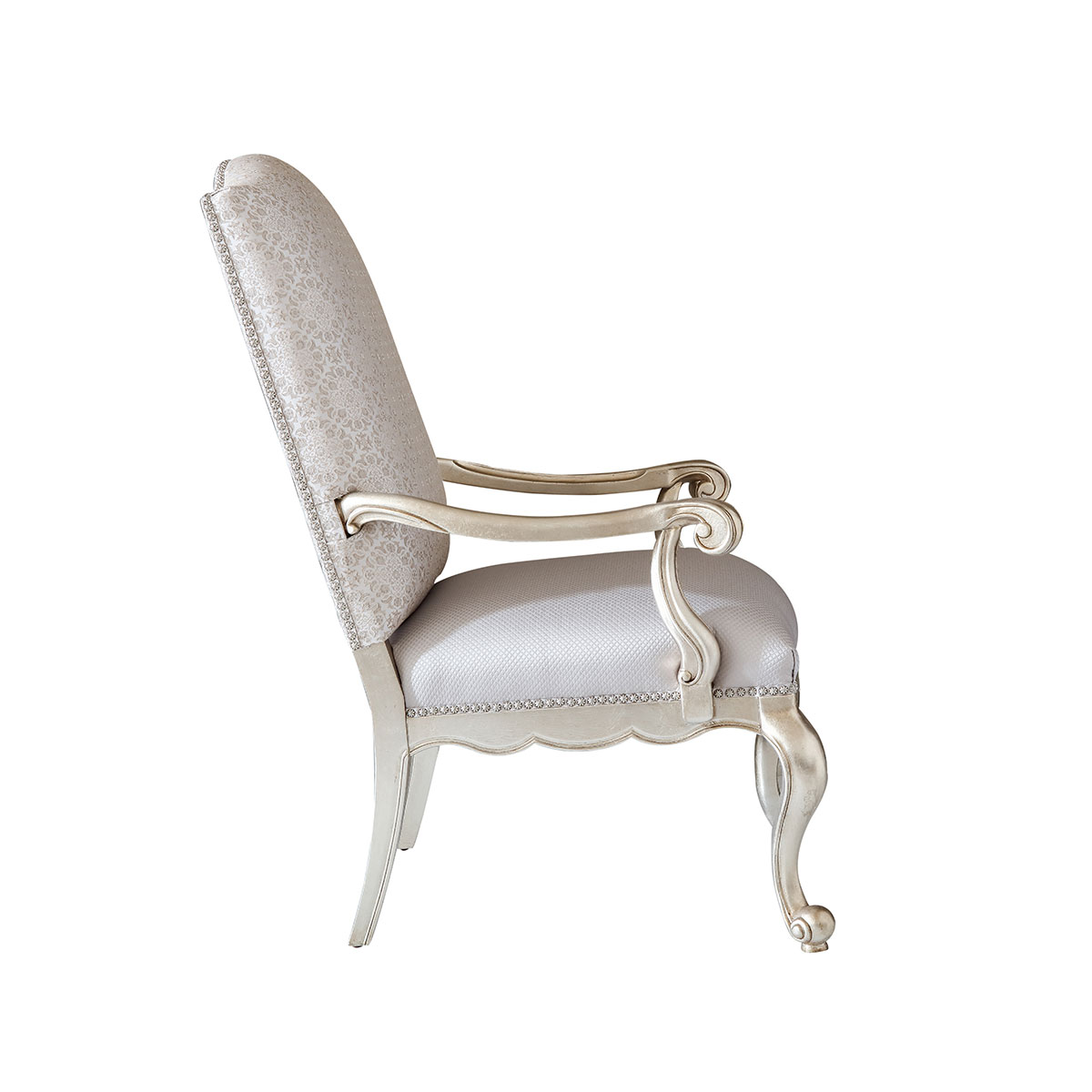 一款集合法式元素包括Camelback Silhouette(駝峰輪廓)造型、旋渦形扶手和S形彎腳的高背休閑椅,并配上觸感舒適的布藝和包有豐厚的填充物坐墊和靠背。
