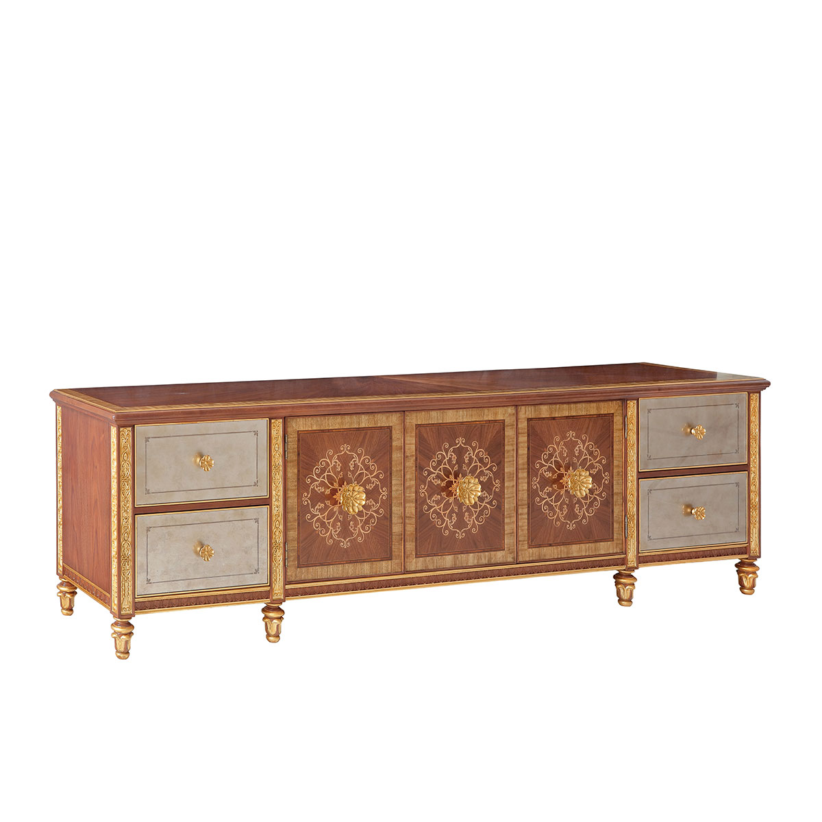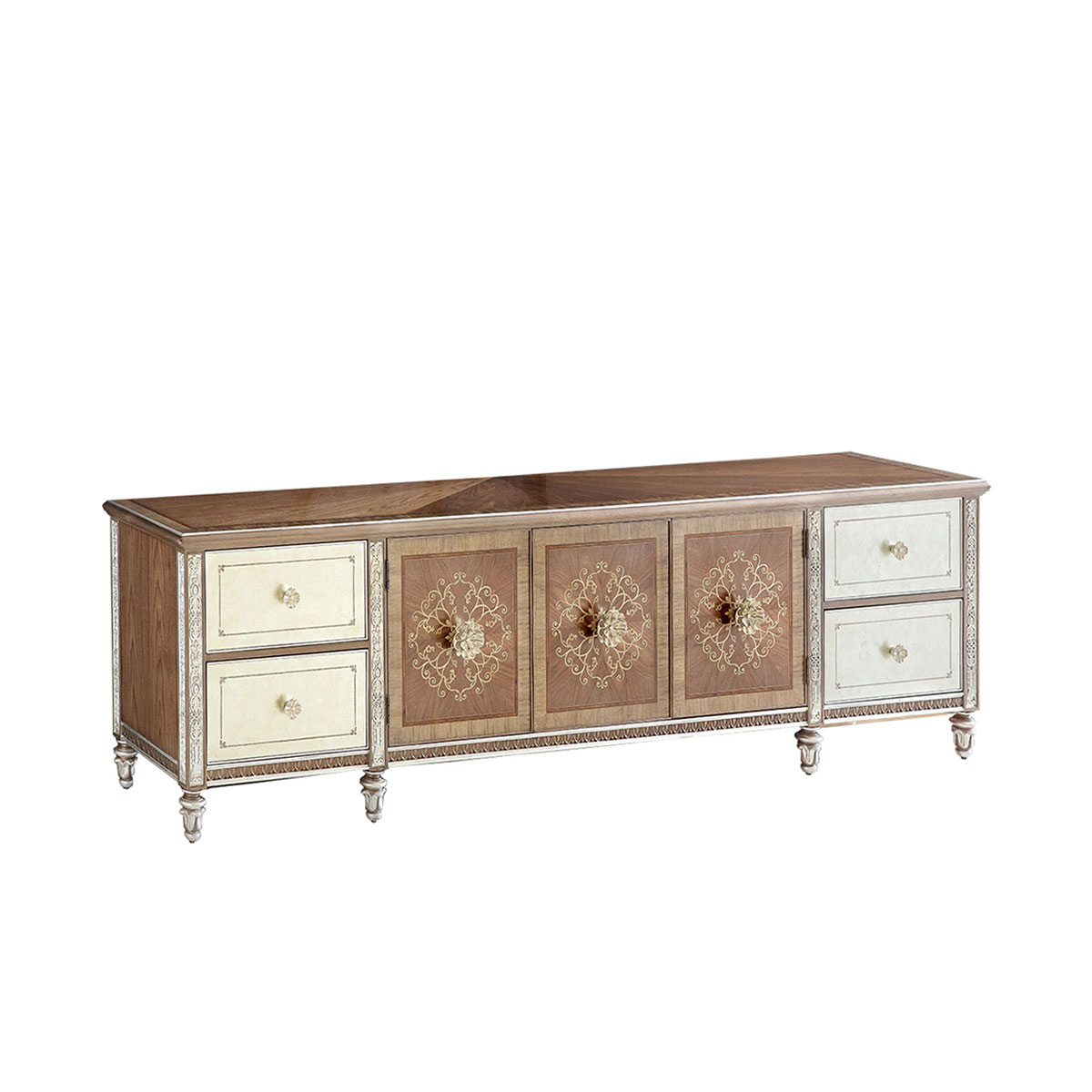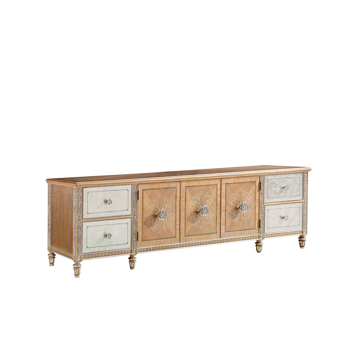 橡膠木+環(huán)保人造板+黑胡桃+艷陽花+櫻桃木等木皮貼面+藝術玻璃