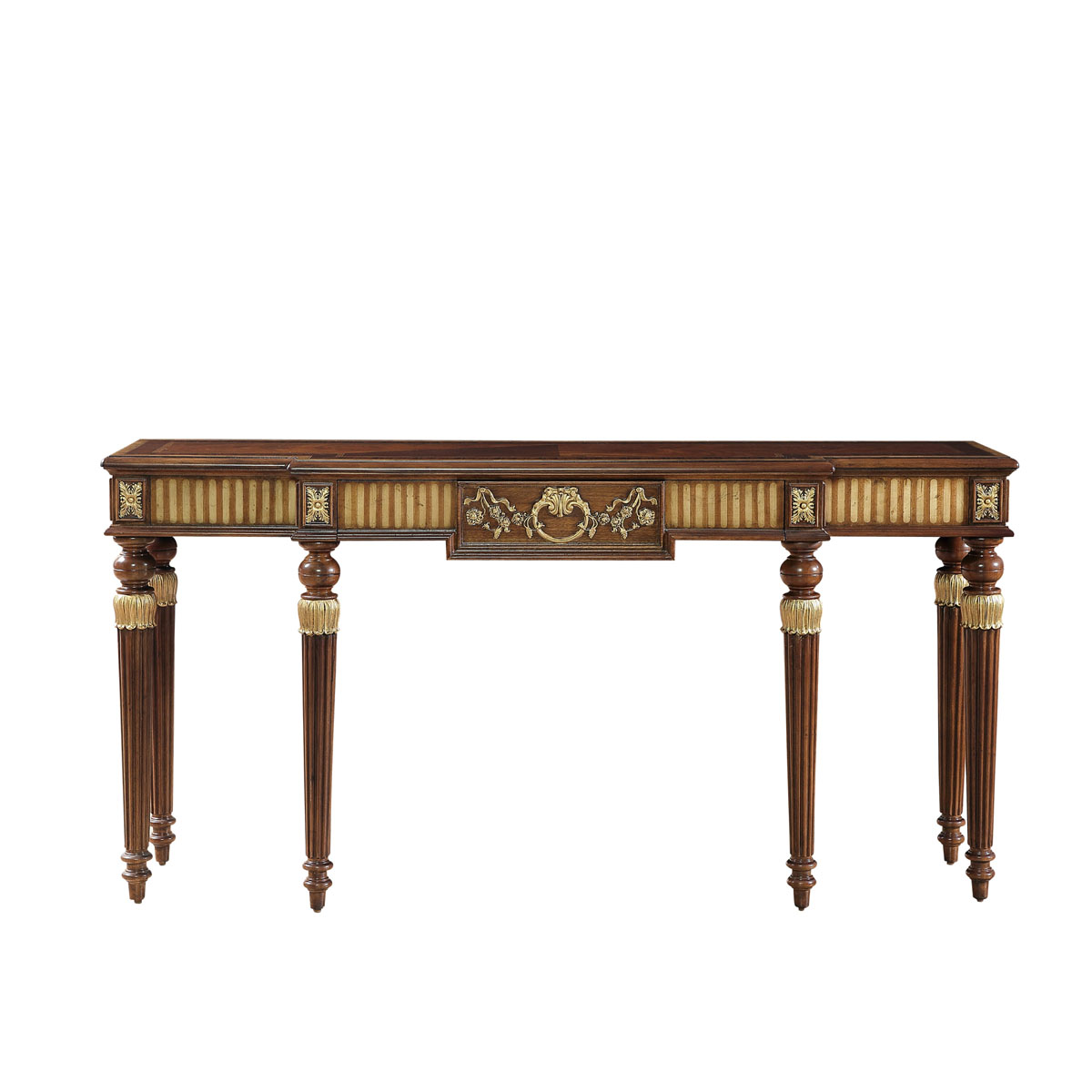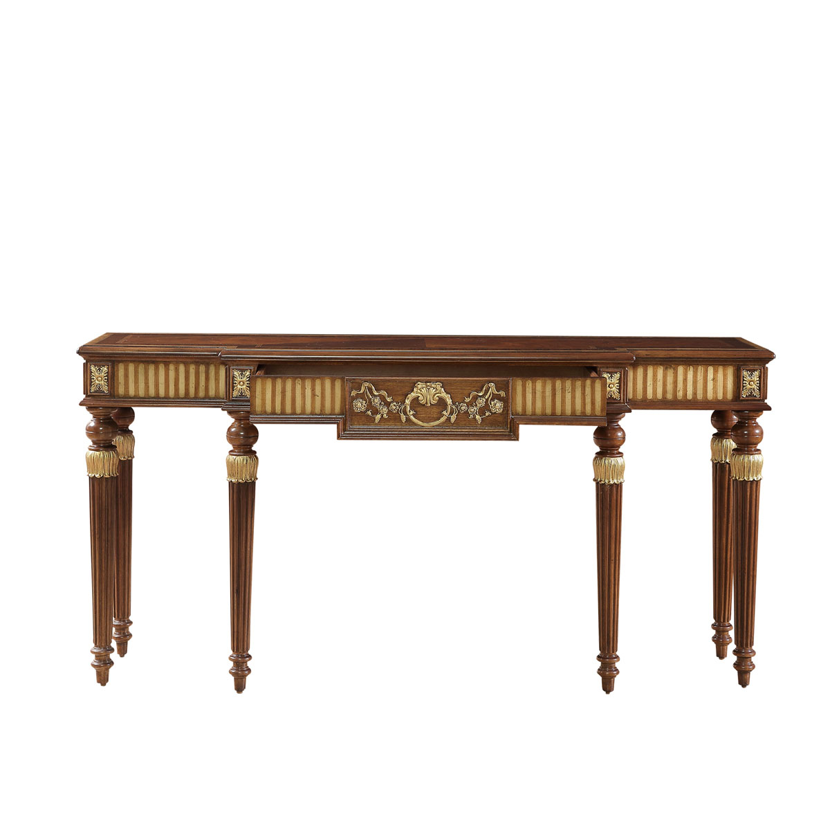* 為表現(xiàn)英國皇室的華麗和莊嚴,以英國溫莎堡為設(shè)計元素。使用新古典風格的錐形腿腳設(shè)計,以顯示王權(quán)的穩(wěn)固地位,配上二龍戲珠的手工雕刻細節(jié)和貼金箔工藝,是豪華系列溫莎堡英式沙發(fā)桌的特色。