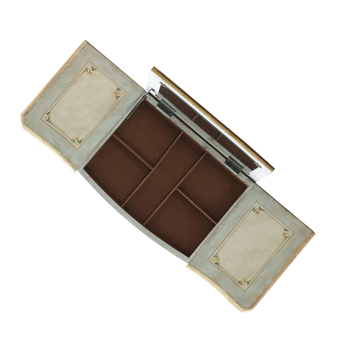 * 四個儲物抽斗,底部采用硬木實木滑軌.中間抽斗的設計可翻下斗面,用來放置鍵盤,抽斗內側有電線孔,抽斗兩邊裝有兩條三節消聲鐵滑軌,滑順耐用; * 中間面板可打開,里面有鏡子和絨布戒指格; * 腳底部裝有可調腳釘