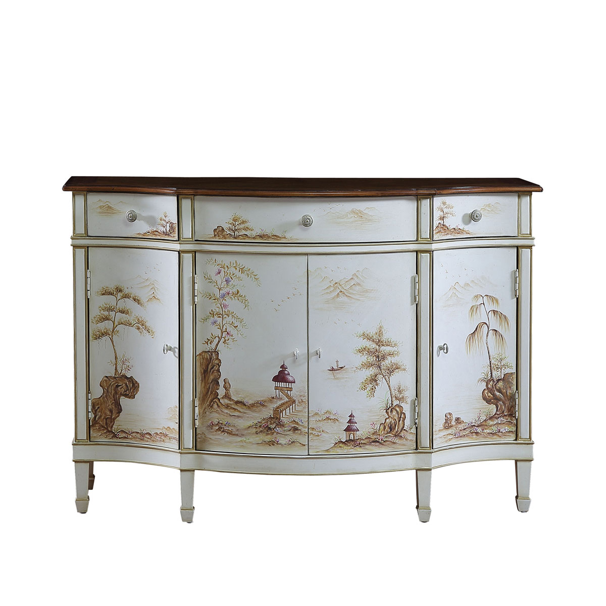 * 花紋圖案都是經(jīng)過專業(yè)工藝師精心繪制而成, 所以每件產(chǎn)品都是獨(dú)一無二的; * 三個(gè)儲(chǔ)物抽斗,其底部采用硬木實(shí)木滑軌; * 門內(nèi)各有一塊可調(diào)層; * 腳底部裝有可調(diào)腳釘;