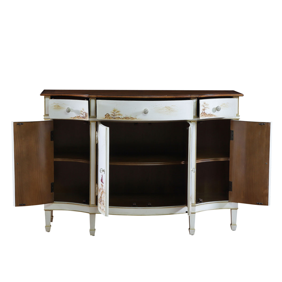 * 在法式仿古白漆上,手繪上意境深遠(yuǎn)的中國風(fēng)山水畫,古銅色與白色形成強(qiáng)烈的對(duì)比,盡顯法國貴族休閑典雅的生活品位;仿若小溪般迂回的曲面設(shè)計(jì),淌過普羅旺斯的薰衣草莊園,攜帶清風(fēng)與熏香,點(diǎn)綴生活的美。