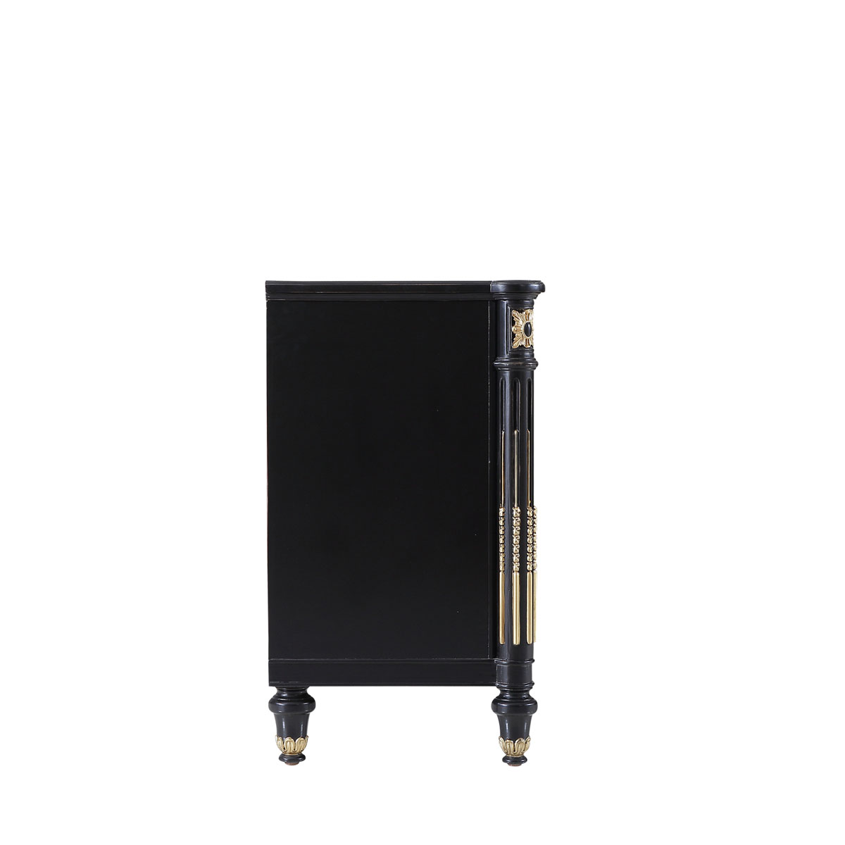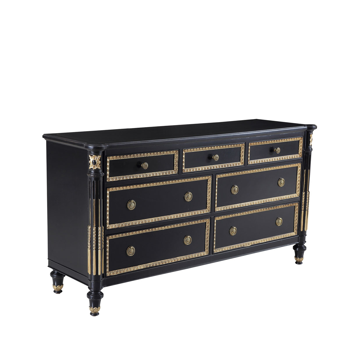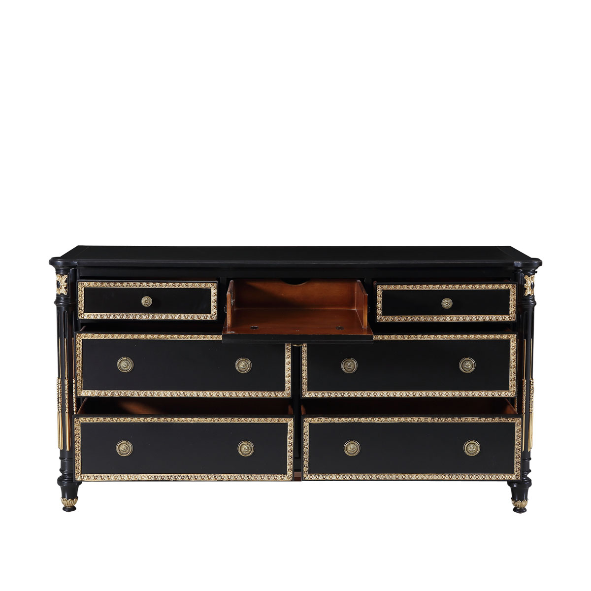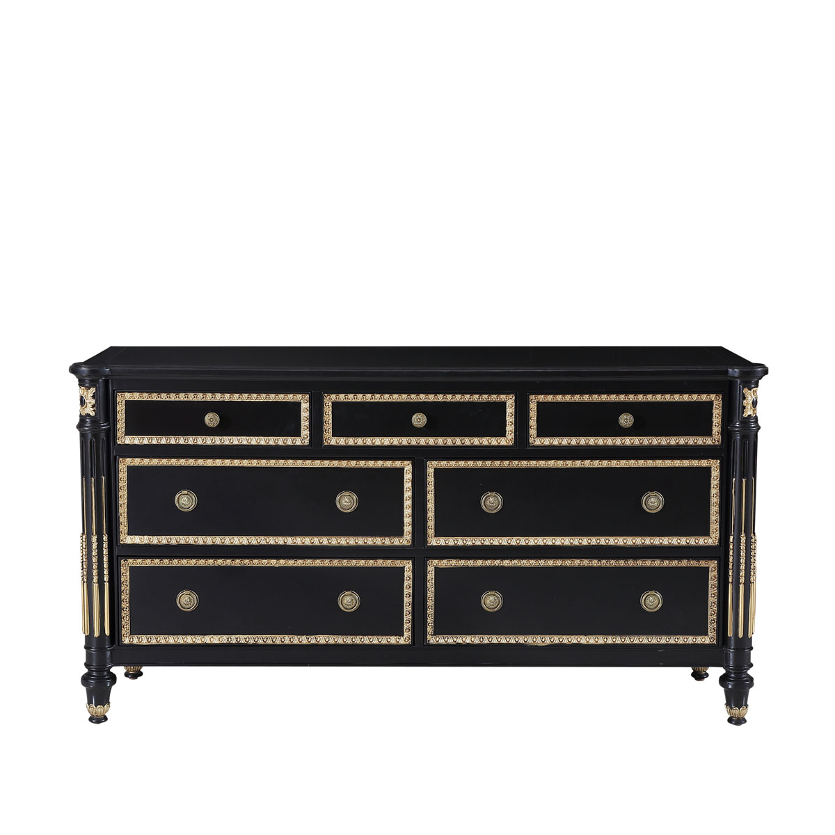* 為表現(xiàn)法國路易時(shí)期的莊嚴(yán)和浪漫,以法國凡爾賽宮為設(shè)計(jì)元素。使用歌頌路易十四時(shí)期的太陽花雕刻,顯示其王權(quán)穩(wěn)固地位的錐形腿腳設(shè)計(jì),配以鉆石圖案的木皮貼面、古銅色的球形把手和貼金工藝,完美演繹了法式宮廷家具的奢華尊貴。