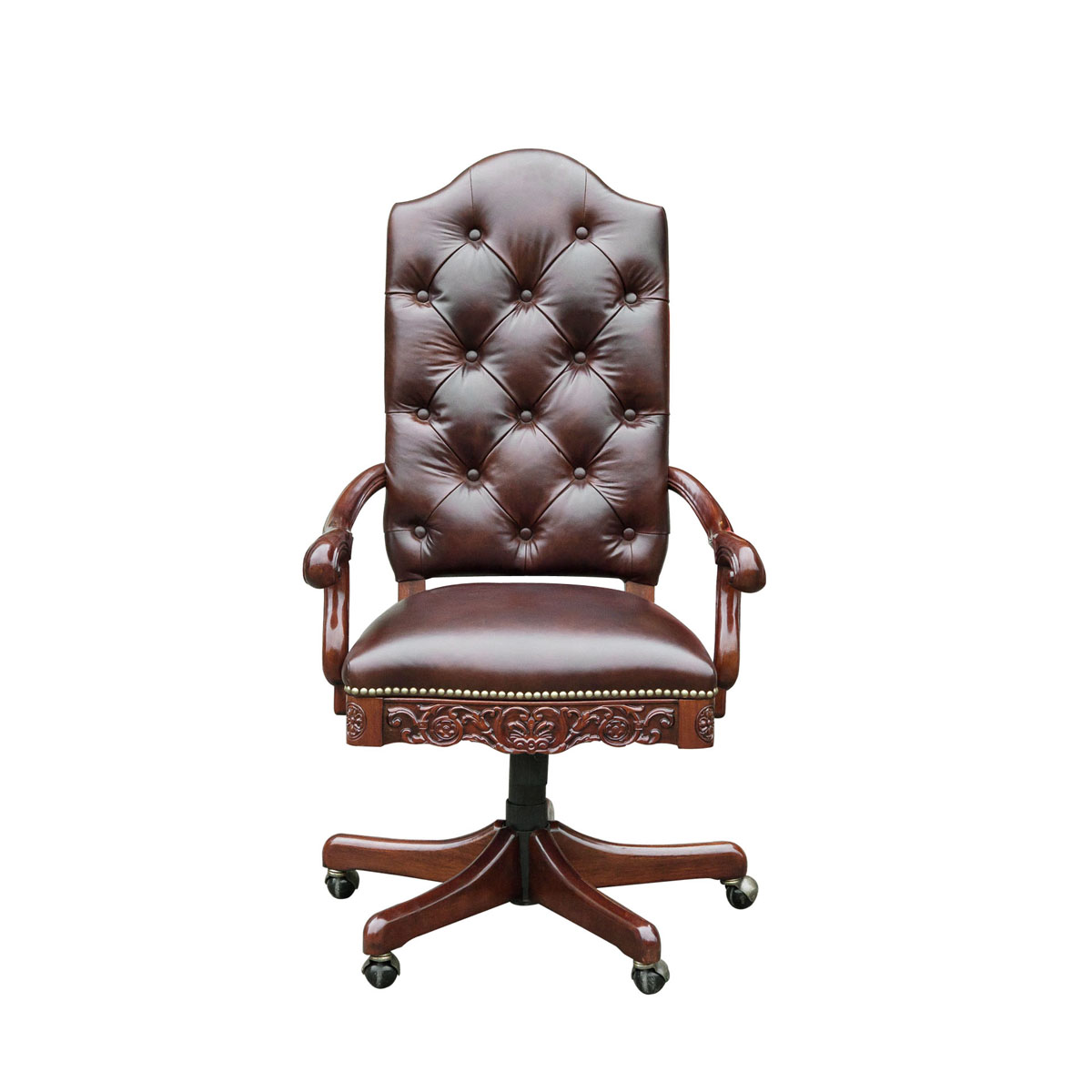 * 作為一個移民國家,各種文明在美國這片神奇的土地上兼容并蓄,在家具上亦如是;這款美式辦公椅用細膩的牛牛皮包裹著Camelbac Silhouette(駝峰輪廓)椅背,配上歐式家具的經典表現形式——拉扣設計,不僅造型美觀而且舒適實用;再點綴一些精致的花朵雕刻,辦公空間也變得如此生意盎然;