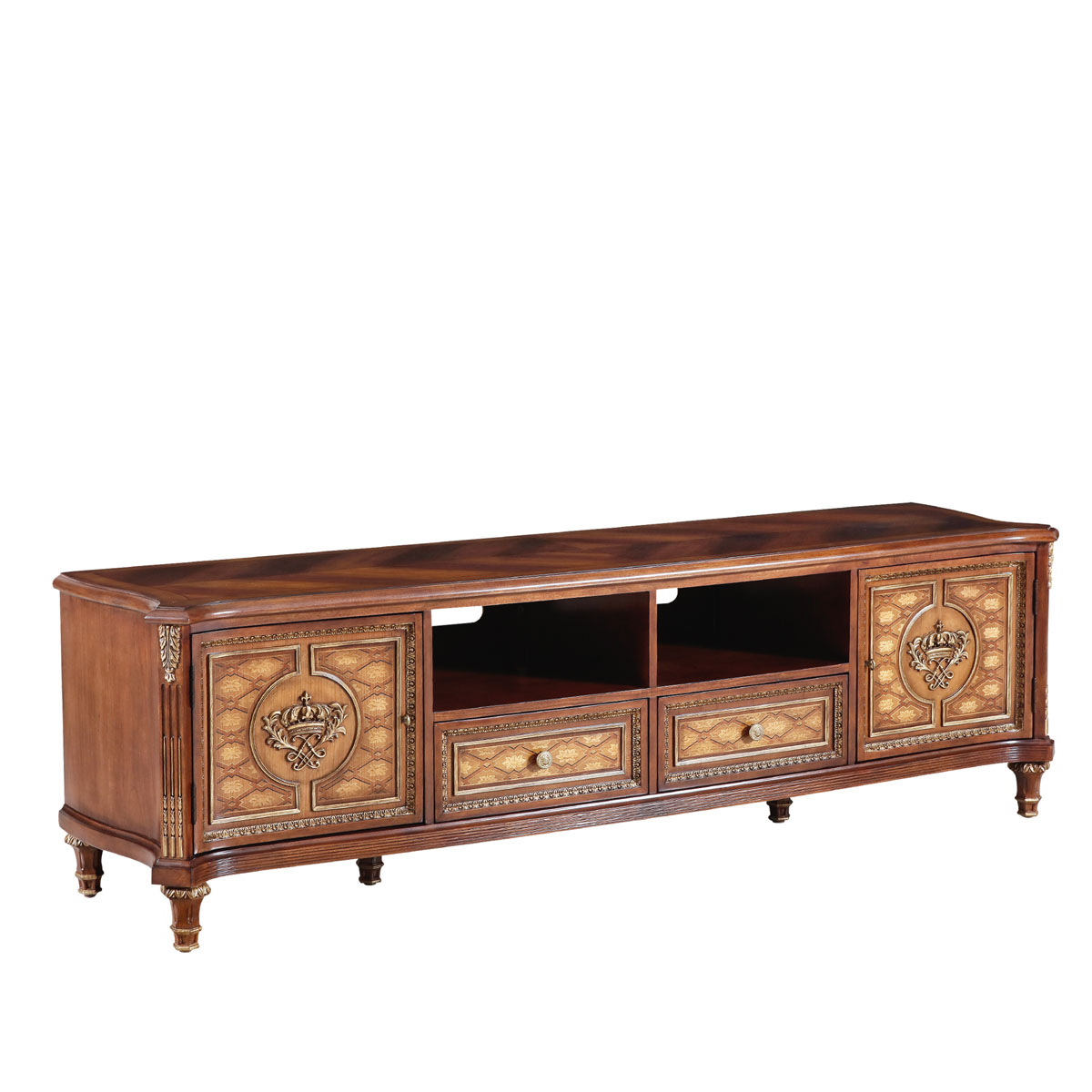 凡爾賽玫瑰電視柜 以 Louis路易時期 Bombe Chest(邦貝柜)新古典風格為設計靈感,多種珍稀木皮貼飾成的木皮拼花清晰美觀,斗面鑲嵌路易十四太陽王的“L”字圖騰雕刻,沐浴著太陽之光象征王權榮耀,