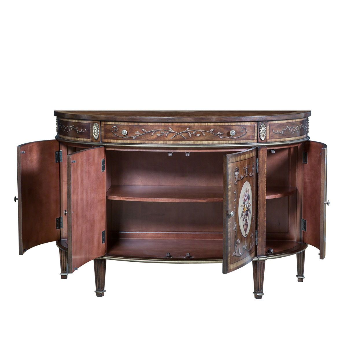 * 花紋圖案都是經過專業工藝師精心繪制而成, 所以每件產品都是獨一無二的; * 一個儲物抽斗,底部采用硬木實木滑軌 * 4扇彩繪實木門板,門內各在一塊層板 * 腳底部裝有可調腳釘;